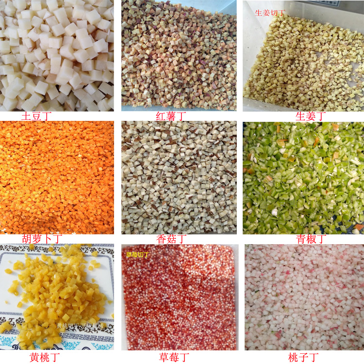主要用于:土豆 萝卜 胡萝卜 地瓜  芋头 莴笋 黄瓜  茄子  辣椒  莲藕  苹果  梨  猕猴桃  菠萝  哈密瓜 草莓 黄桃 火腿肠等切丁或块。
